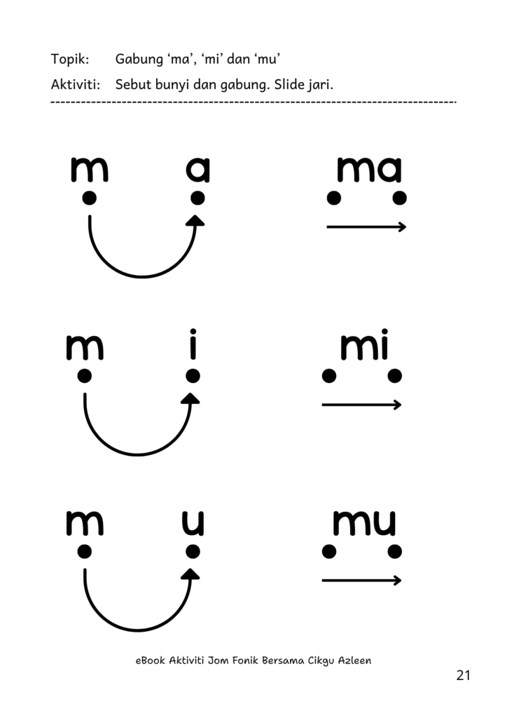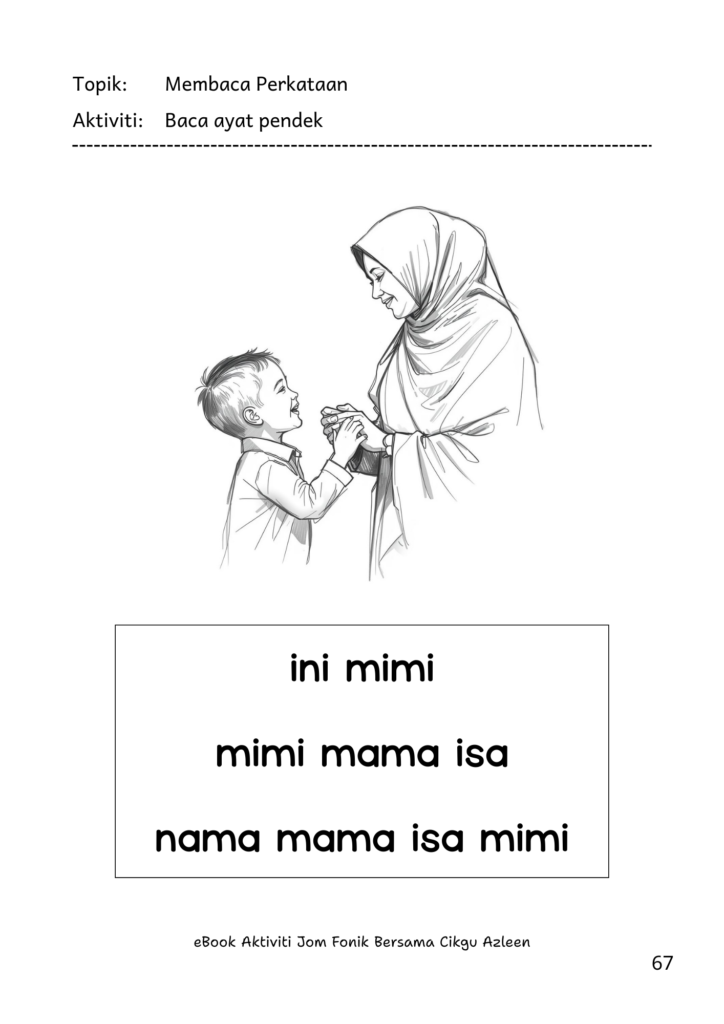 Ia mengandungi aktiviti bertahap daripada pengenalan bunyi โ gabung bunyi โ membaca ayat pendek.